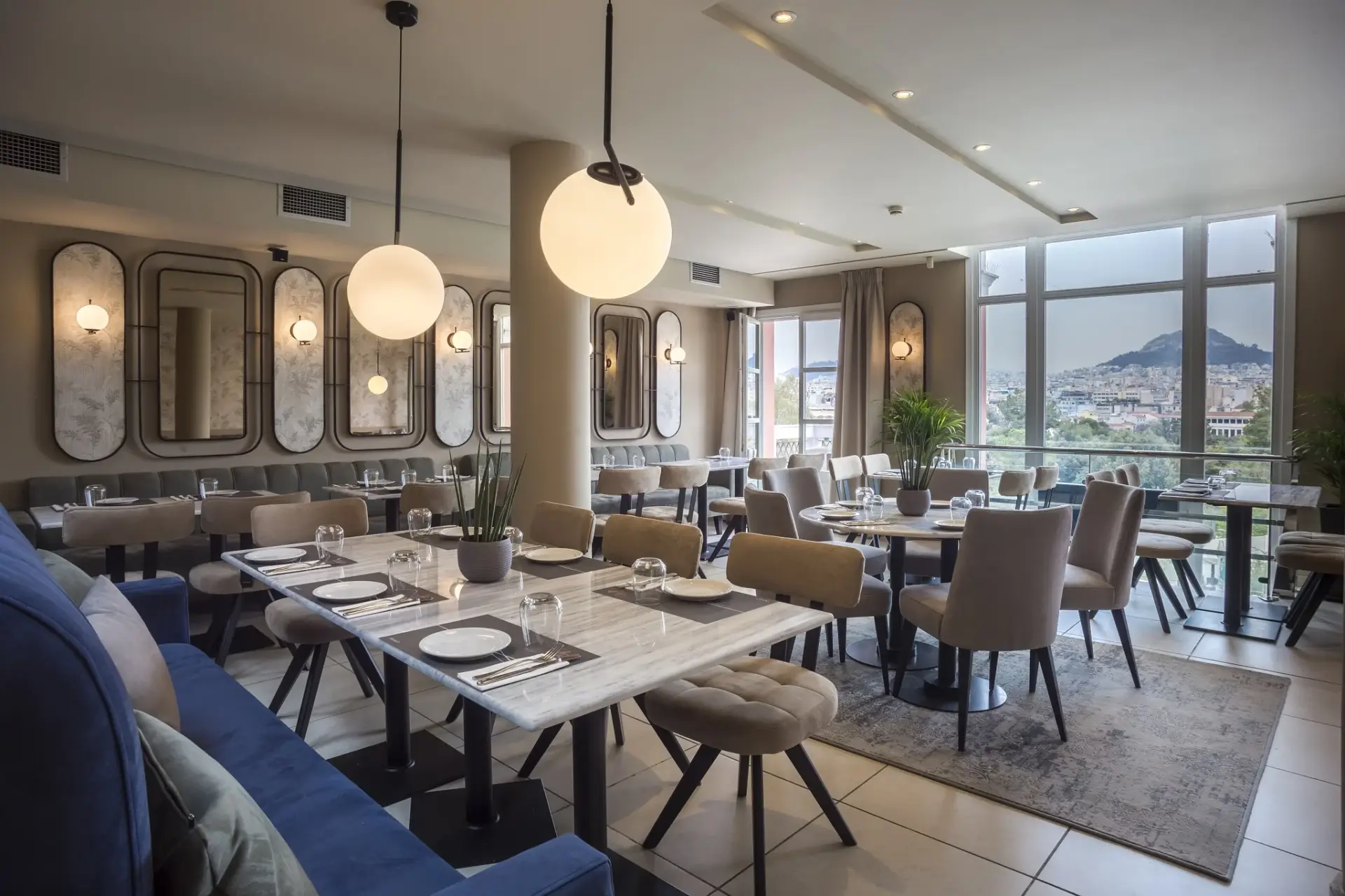 Χτισμένο στρατηγικά στους πρόποδες του λόφου των Νυμφών που φιλοξενεί το Αστεροσκοπείο Αθηνών, το τριώροφο εστιατόριο συνομιλεί με τον ιστορικό λόφο της Πνύκας, τον σηματοδότη λόφο των Μουσών [Φιλοπάππου] και υποκλίνεται στον επιβλητικό Ιερό Βράχο της Ακρόπολης που στέκει απέναντι του.